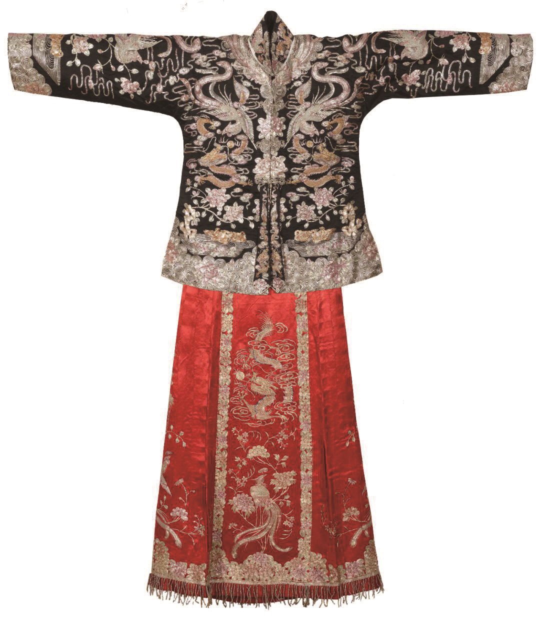 与满族龙袍中威严庄重的形象相映成趣,馆藏清代至民国时期的汉族平金银龙凤纹女嫁衣上的龙凤呈祥纹样呈现出一派喜庆祥和的景象。嫁衣上身为青缎平金银迭绣龙凤纹女褂,下装配大红缎平金绣龙凤纹马面裙,左右衣身用金、银线盘绣出龙、凤、鸳鸯、牡丹、莲花、祥云等吉祥纹样,并以门襟为中心对称分布,形成“对龙对凤”的构图样式,华美富丽。