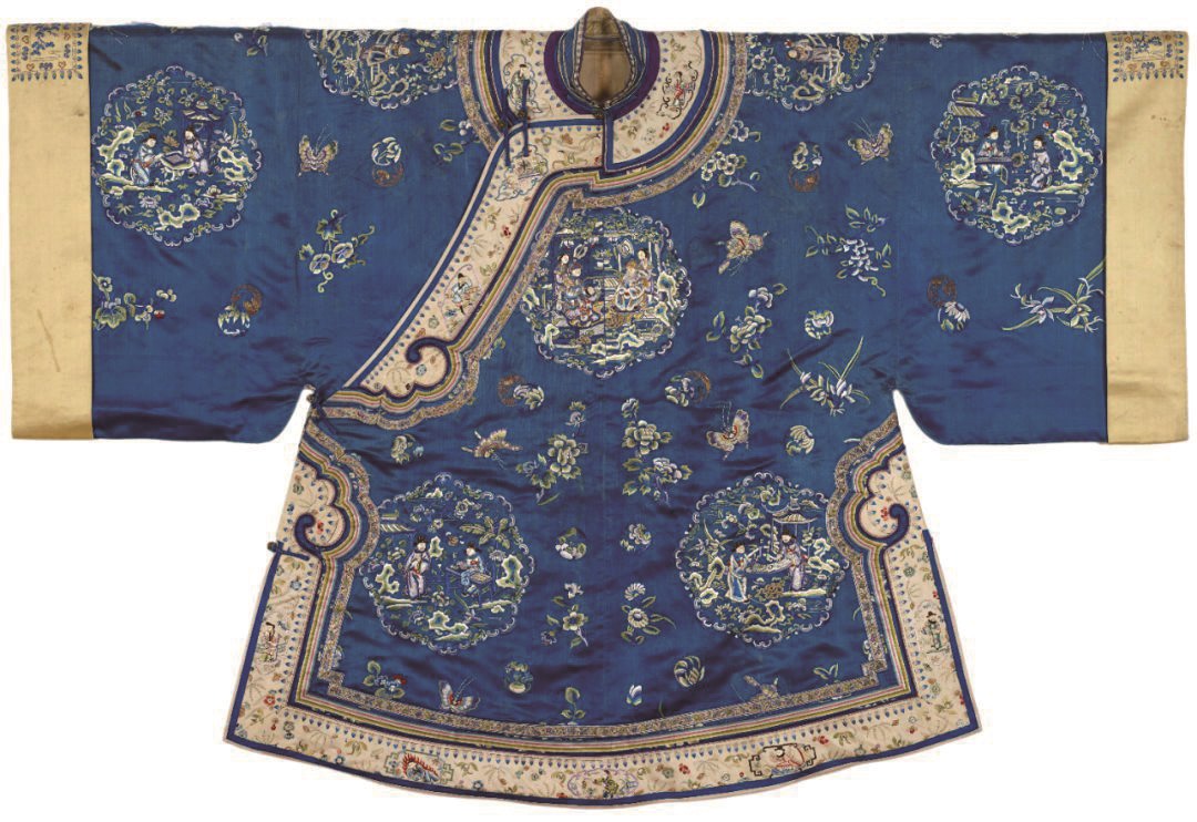 馆藏汉族蓝色缎五彩绣十二团窠人物纹广袖女袄,就是以唐代人物郭子仪为纹样主题,彩绣十二团窠人物纹样:衣身正中一窠刺绣郭子仪贺寿纹;前袖及底摆四窠刺绣琴棋书画人物纹,通过人物抚琴、弈棋、书写、赏画的场景组合,体现古代文人雅士的清雅品行;衣身后中一窠刺绣夫妻拜寿纹,展现了郭子仪子媳夫妇携手祝寿情景;衣身两肩、后袖及底摆六窠刺绣子婿拜寿纹,纹样人物通过拜送宝瓶、鼎、万年青、石榴、如意穗、官印等不同寿礼引申出“平升三级”“禄位高升”“万年长青”“榴开百子”“岁岁如意”“送印升官”等寓意,表达了人们对儒家传统仁孝美德的赞颂和对英雄人物的褒扬。