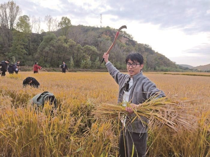 延安南泥湾,千亩稻田喜迎丰收,采风团90后自媒体博主体验割稻谷。在延安文艺纪念馆的展壁上,陈列着这样一首小诗。