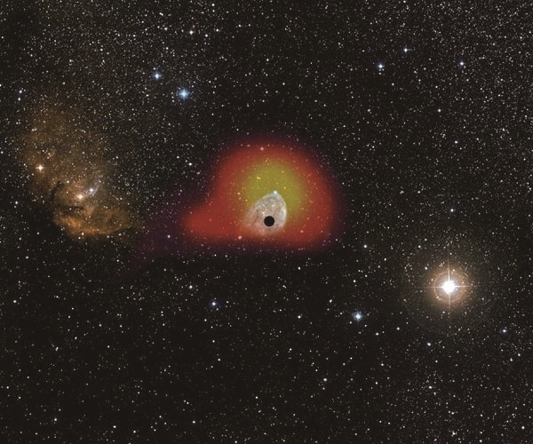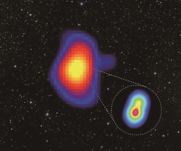 位于南天区的微类星体V4641 Sgr,是拉索测到的具有最高能量的伽马射线源。不同颜色表示了拉索测到的伽马射线强度,红色-黄色-白色表现了强度由弱到强的变化,右下的放大图显示了黑洞附近的x-射线照片,显示了喷流可能的方向和长度。