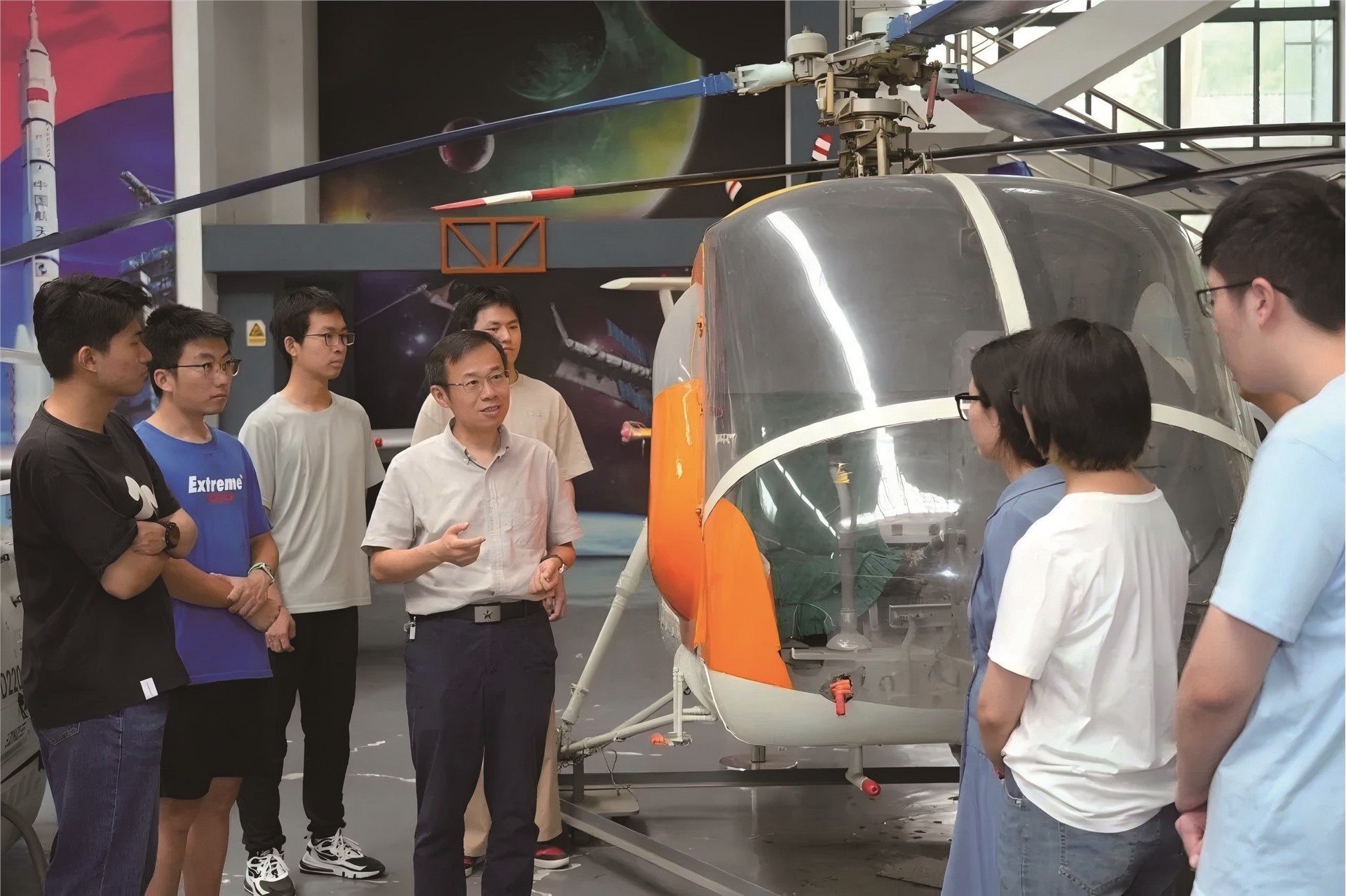 课程组教师在航空航天馆内的直升机(由南航师生研制的我国第一架自主设计制造的直升机“延安二号”)旁授课。