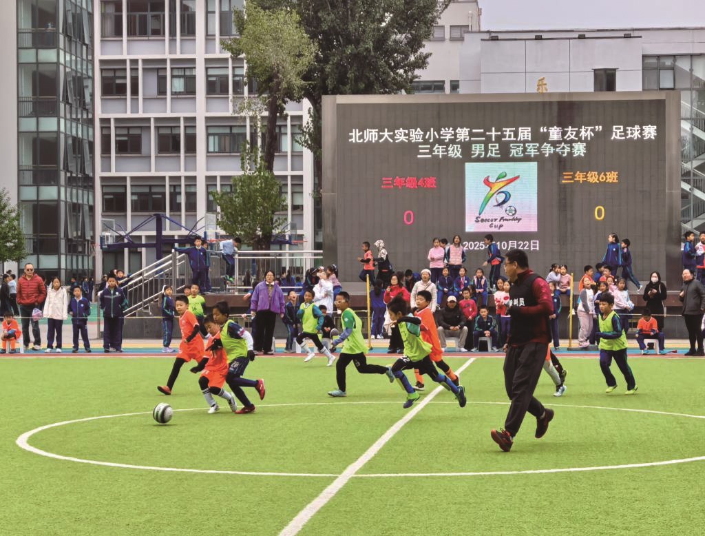 北京师范大学实验小学学生在踢球。