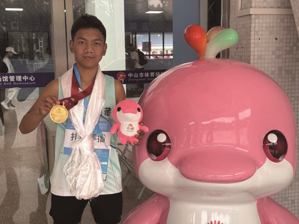 15岁的扎西平措高举着金牌,胸前的哈达轻轻飘动。全国残特奥会特奥田径赛场上,这位来自西藏林芝的少年以一记全力以赴的冲刺,夺得50米短跑冠军。