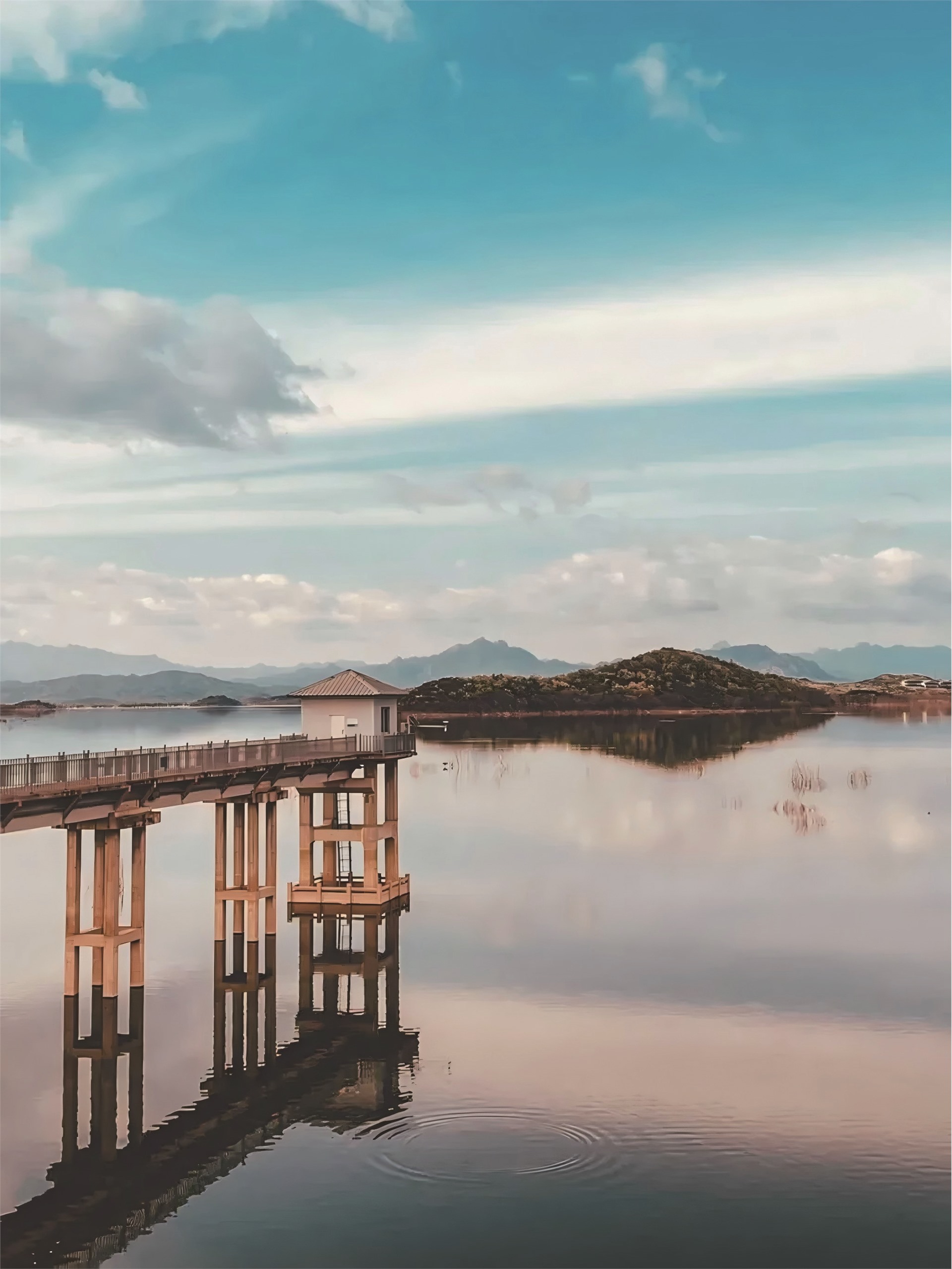 导航“石马峪村”,当你看到一座小房子沿栈道延伸至湖蓝色的水面中央,就来到了环密云水库之旅的始发站——石马峪水库大坝,在这里你会对密云水库的辽阔,第一次有了认知。