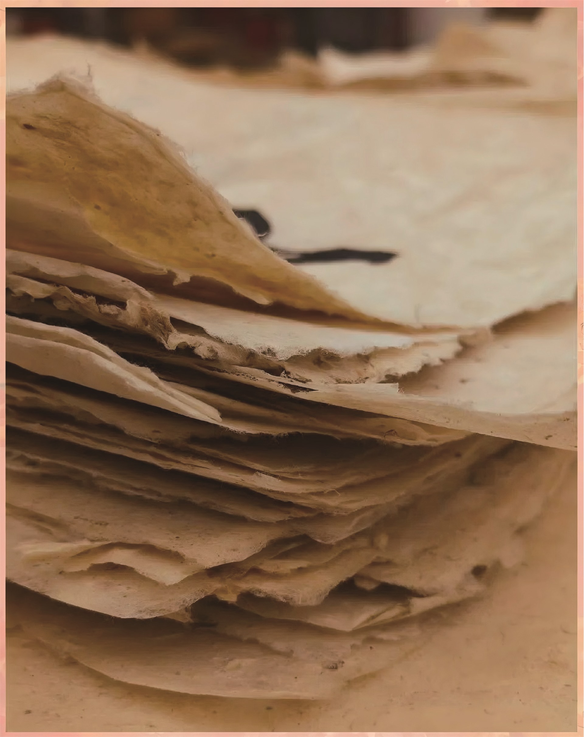 将纸浆倒在模具里,并用那根头上有一个小十字的木棒不停地搅动,使纸浆均匀地铺在模具上。待纸浆铺均匀后,再把模具平端着拿出小水坑,放到阳光可以充足照射到的地方。等纸浆在模具上晒干后,撕下来的就是一张地道的桑皮纸了。