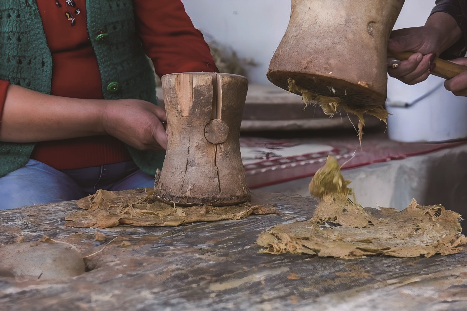 捞出煮熟的桑皮放在一块长方形的薄石板上,匠人跪在石板前,在自己的双腿上盖一块布,然后举起一种柄短头长的木制榔头砸桑皮。边砸边翻,直至将桑皮砸成泥饼后放进一个半埋在地下的木桶内。