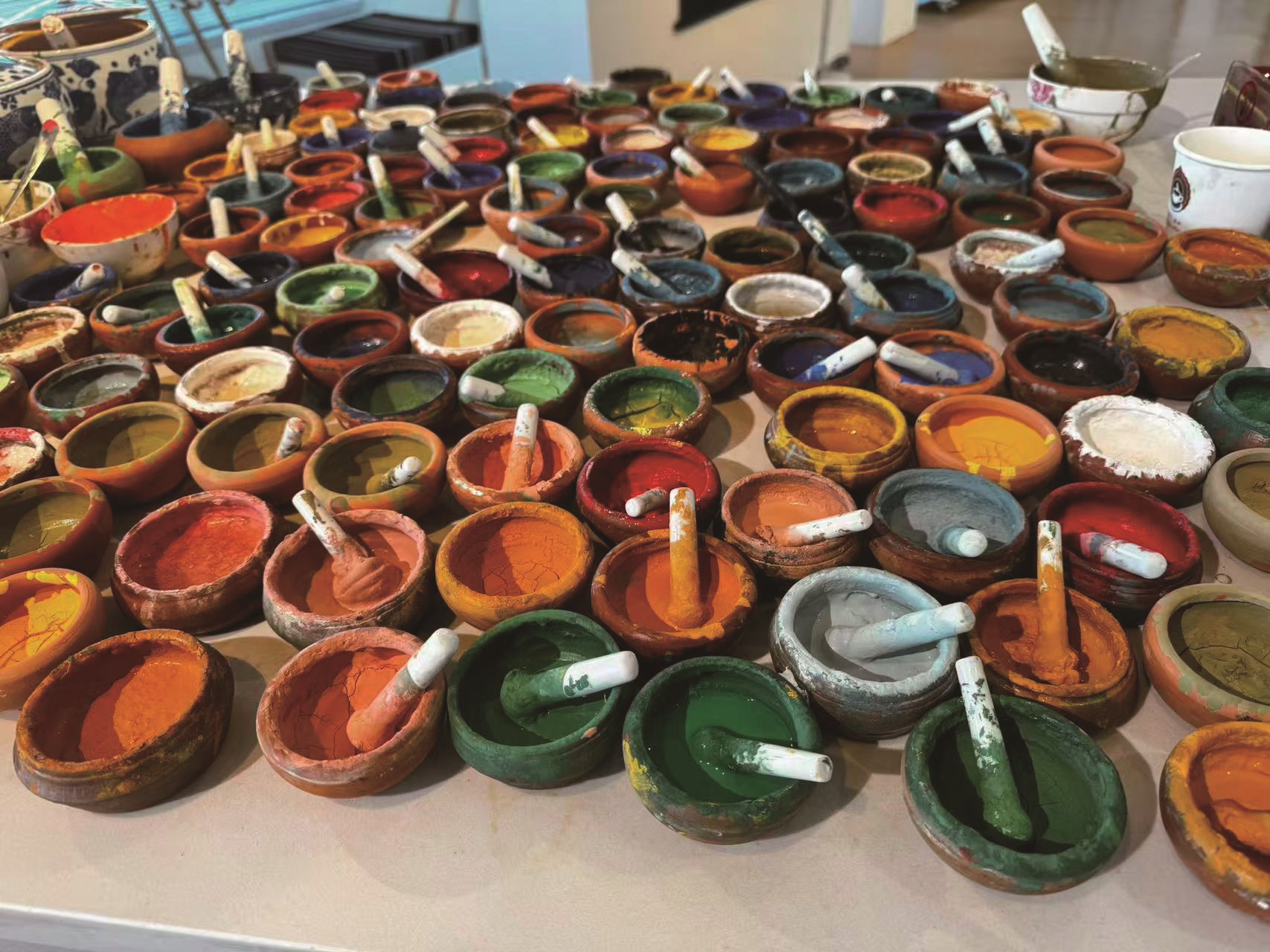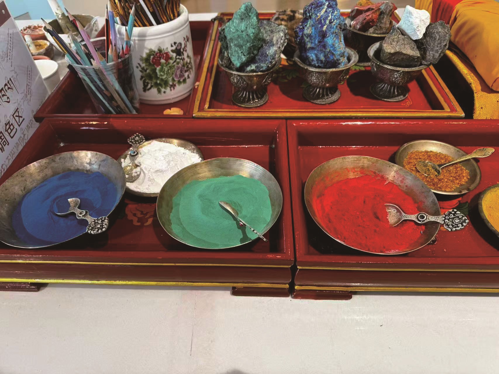 颜料则源自天然矿石和植物。工作台上的小陶罐里,装着精心研磨的孔雀石、青金石、朱砂等。“机器磨的颗粒不均匀,画不出有生命力的色泽。”体验馆画师群培说,手工研磨颜料至今仍是入门必修课。