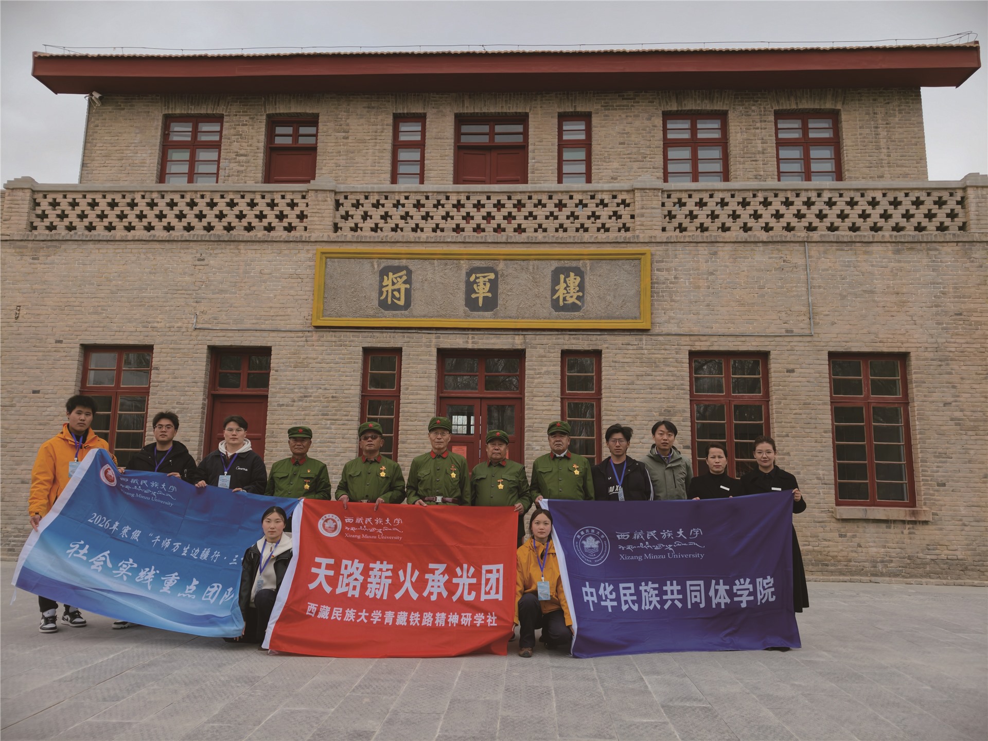 研学社成员与铁七师老战士在将军楼前合影。摄影:郭江波